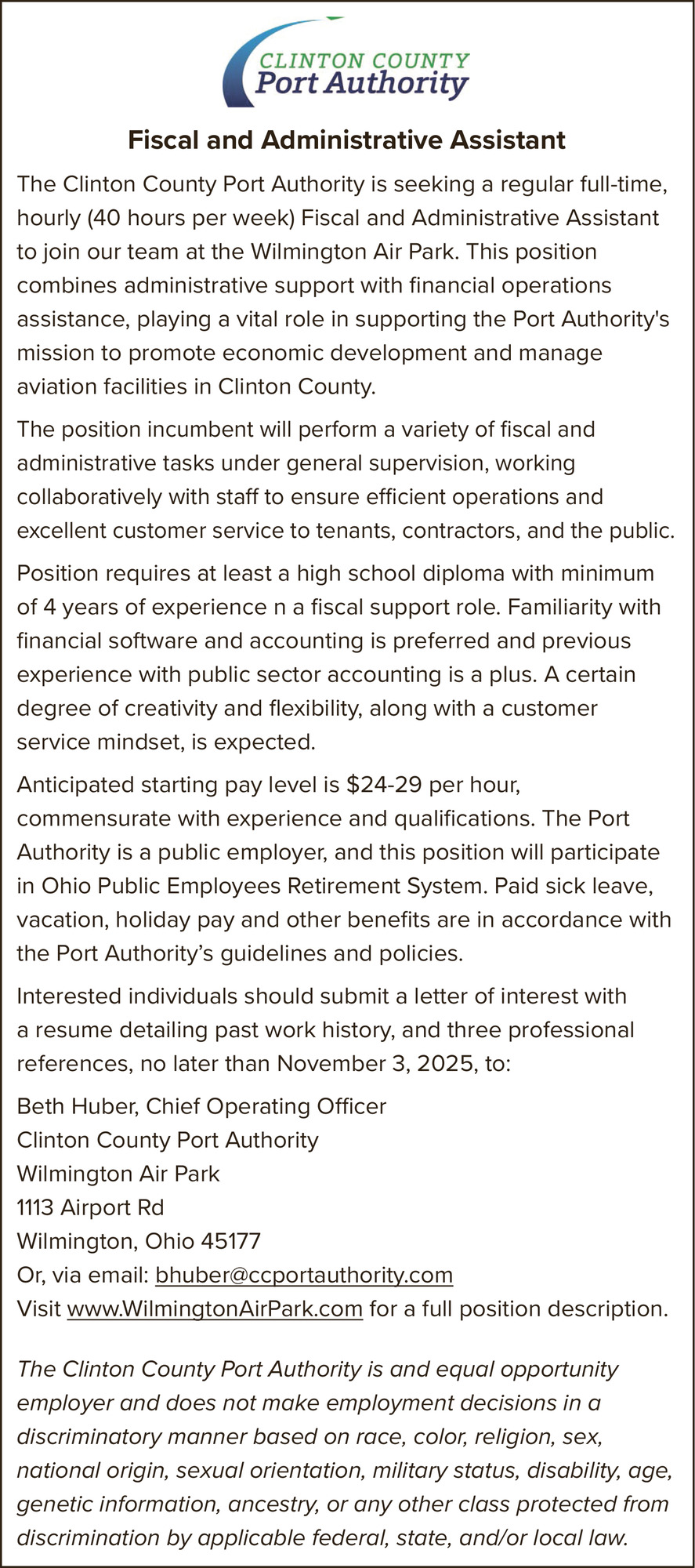 Oct 25, 2025. Clinton County Port Authority Jobs Ads from News Journal